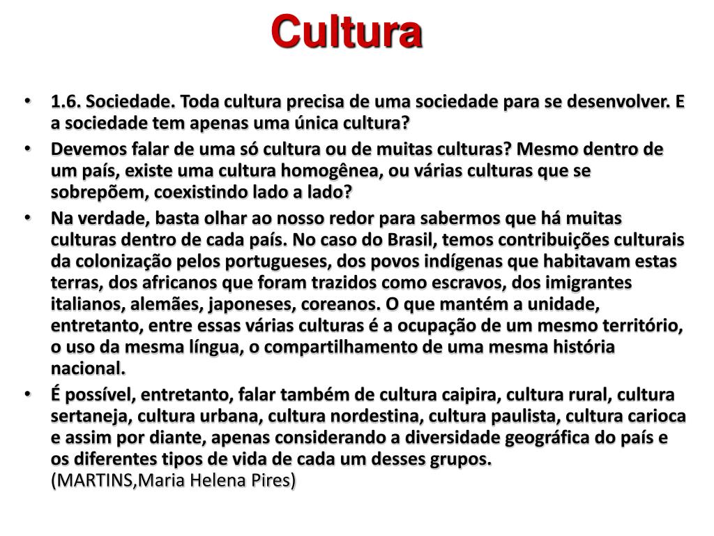 Cultura • 1.6. Sociedade. Toda cultura precisa de uma sociedade para se desenvolver. E a sociedade tem apenas uma única cultura? • Devemos falar de uma só cultura ou de muitas culturas? Mesmo dentro de um país, existe uma cultura homogênea, ou várias culturas que se sobrepõem, coexistindo lado a lado? • Na verdade, basta olhar ao nosso redor para sabermos que há muitas culturas dentro de cada país. No caso do Brasil, temos contribuições culturais da colonização pelos portugueses, dos povos indígenas que habitavam estas terras, dos africanos que foram trazidos como escravos, dos imigrantes italianos, alemães, japoneses, coreanos. O que mantém a unidade, entretanto, entre essas várias culturas é a ocupação de um mesmo território, o uso da mesma língua, o compartilhamento de uma mesma história nacional. • É possível, entretanto, falar também de cultura caipira, cultura rural, cultura sertaneja, cultura urbana, cultura nordestina, cultura paulista, cultura carioca e assim por diante, apenas considerando a diversidade geográfica do país e os diferentes tipos de vida de cada um desses grupos. (MARTINS,Maria Helena Pires)