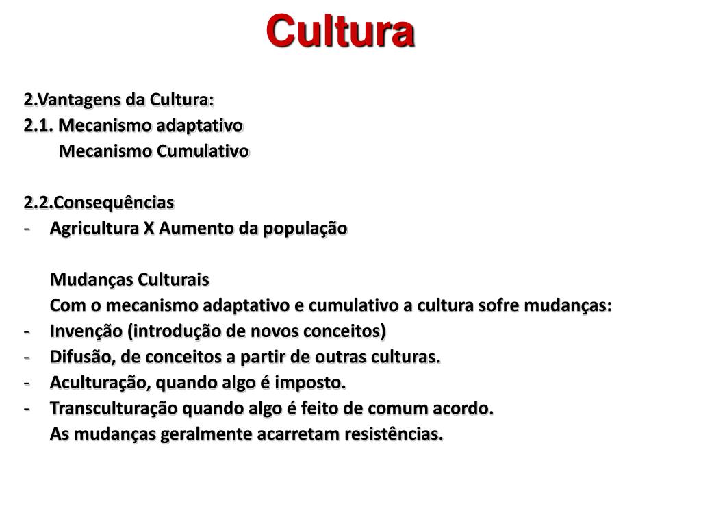 Cultura 2.Vantagens da Cultura: 2.1. Mecanismo adaptativo Mecanismo Cumulativo 2.2.Consequências • Agricultura X Aumento da população Mudanças Culturais Com o mecanismo adaptativo e cumulativo a cultura sofre mudanças: • Invenção (introdução de novos conceitos) • Difusão, de conceitos a partir de outras culturas. • Aculturação, quando algo é imposto. • Transculturação quando algo é feito de comum acordo. As mudanças geralmente acarretam resistências.