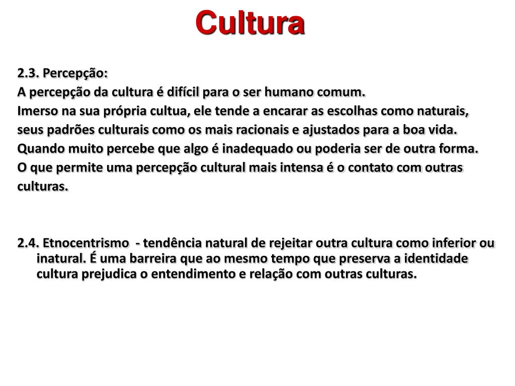 Cultura 2.3. Percepção: A percepção da cultura é difícil para o ser humano comum. Imerso na sua própria cultua, ele tende a encarar as escolhas como naturais, seus padrões culturais como os mais racionais e ajustados para a boa vida. Quando muito percebe que algo é inadequado ou poderia ser de outra forma. O que permite uma percepção cultural mais intensa é o contato com outras culturas. 2.4. Etnocentrismo - tendência natural de rejeitar outra cultura como inferior ou inatural. É uma barreira que ao mesmo tempo que preserva a identidade cultura prejudica o entendimento e relação com outras culturas.