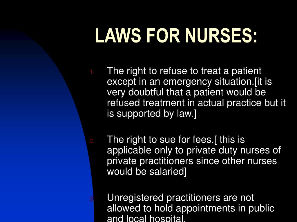 LAWS FOR NURSES: • The right to refuse to treat a patient except in an emergency situation.[it is very doubtful that a patient would be refused treatment in actual practice but it is supported by law.] • The right to sue for fees,[ this is applicable only to private duty nurses of private practitioners since other nurses would be salaried] • Unregistered practitioners are not allowed to hold appointments in public and local hospital.