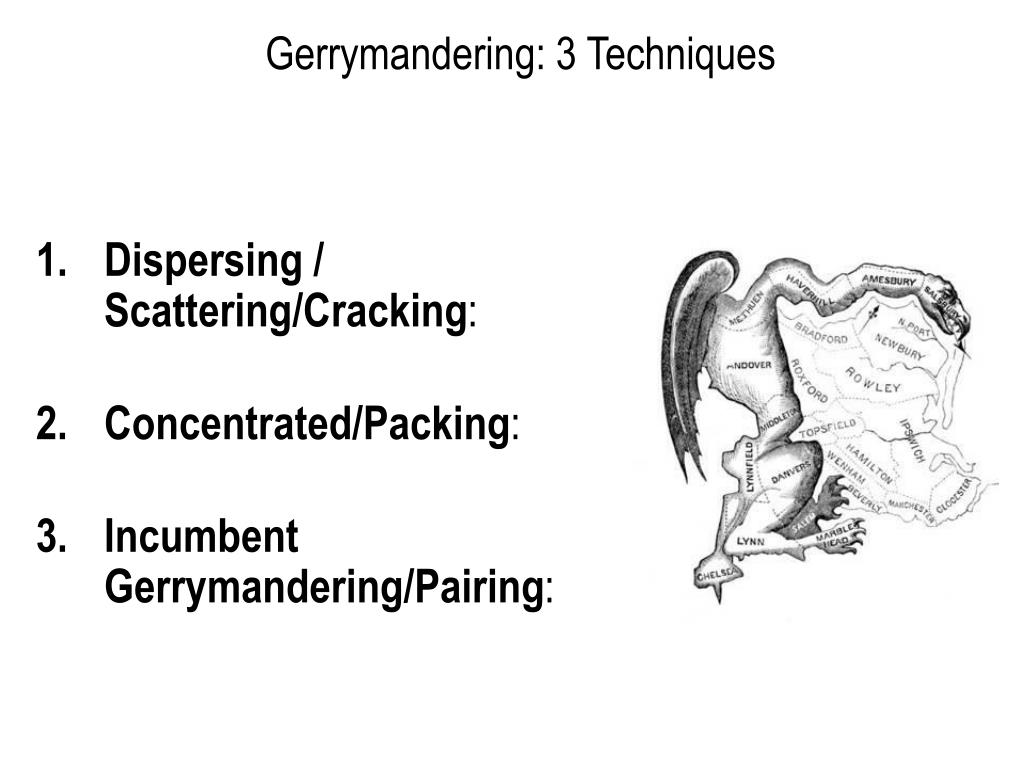 0 Gerrymandering: 3 Techniques • Dispersing / Scattering/Cracking: • Concentrated/Packing: • Incumbent Gerrymandering/Pairing: