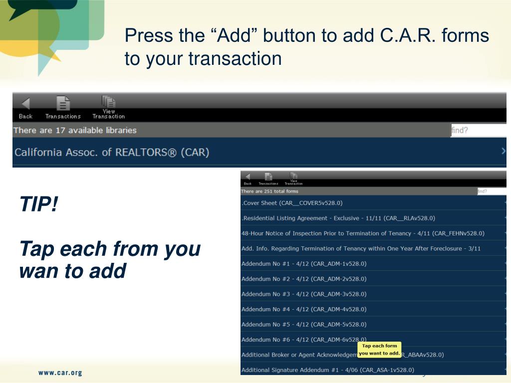 Press the “Add” button to add C.A.R. forms to your transaction TIP! Tap each from you wan to add