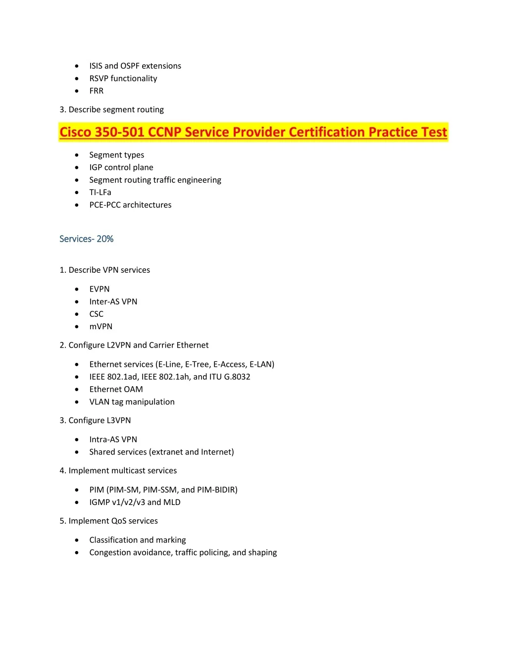 ISIS and OSPF extensions RSVP functionality FRR 3. Describe segment routing Cisco 350-501 CCNP Service Provider Certification Practice Test Segment types IGP control plane Segment routing traffic engineering TI-LFa PCE-PCC architectures Services Services- - 20% 20% 1. Describe VPN services EVPN Inter-AS VPN CSC mVPN 2. Configure L2VPN and Carrier Ethernet Ethernet services (E-Line, E-Tree, E-Access, E-LAN) IEEE 802.1ad, IEEE 802.1ah, and ITU G.8032 Ethernet OAM VLAN tag manipulation 3. Configure L3VPN Intra-AS VPN Shared services (extranet and Internet) 4. Implement multicast services PIM (PIM-SM, PIM-SSM, and PIM-BIDIR) IGMP v1/v2/v3 and MLD 5. Implement QoS services Classification and marking Congestion avoidance, traffic policing, and shaping