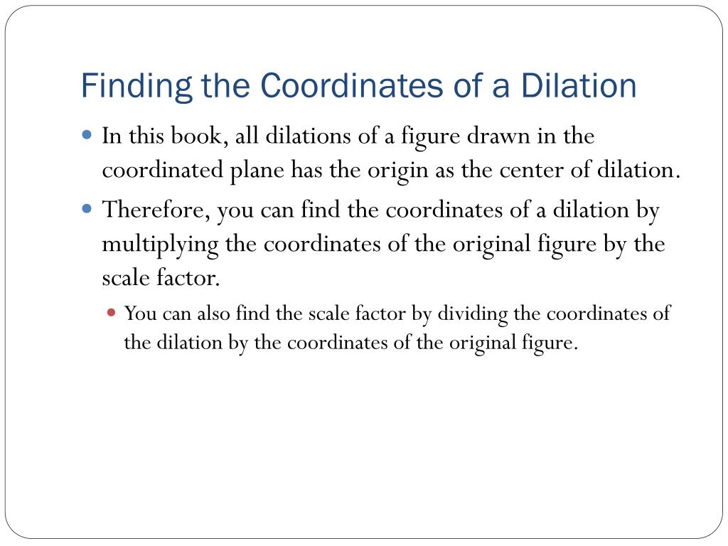 Finding the Coordinates of a Dilation • In this book, all dilations of a figure drawn in the coordinated plane has the origin as the center of dilation. • Therefore, you can find the coordinates of a dilation by multiplying the coordinates of the original figure by the scale factor. • You can also find the scale factor by dividing the coordinates of the dilation by the coordinates of the original figure.