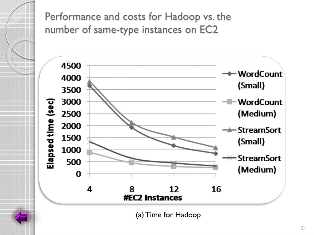 Performance and costs for Hadoop vs. thenumber of same-type instances on EC2 (a) Time for Hadoop