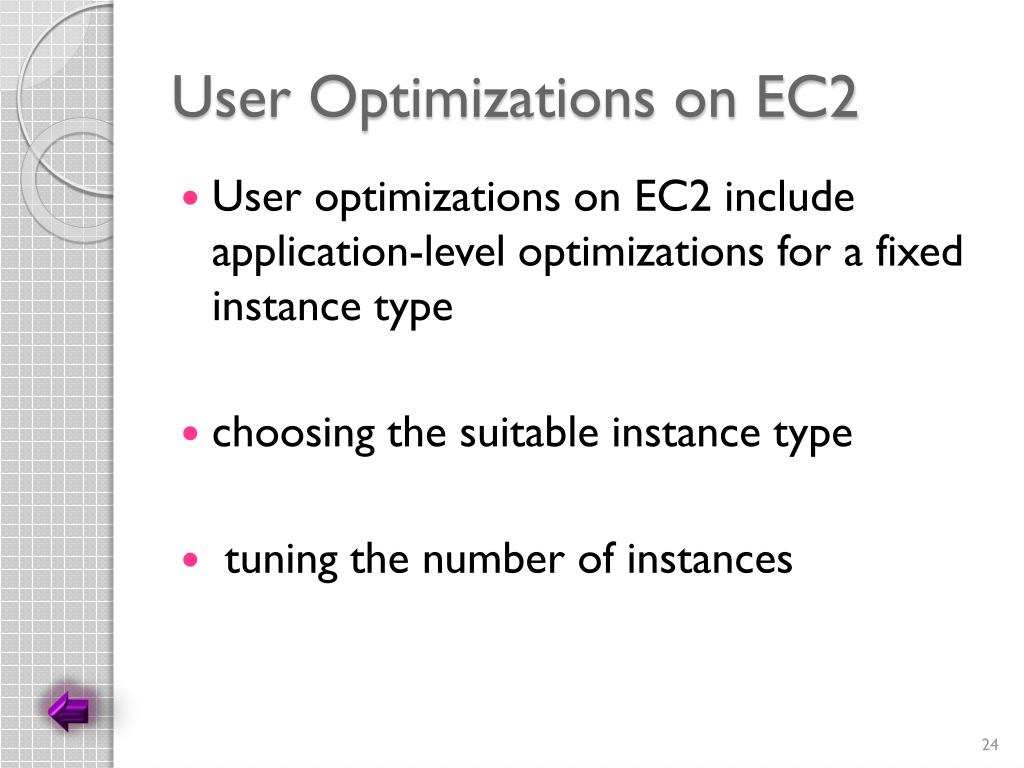 User Optimizations on EC2 • User optimizations on EC2 include application-level optimizations for a fixed instance type • choosing the suitable instance type • tuning the number of instances