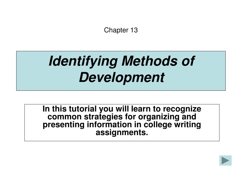 Identifying Methods of Development In this tutorial you will learn to recognize common strategies for organizing and presenting information in college writing assignments. Chapter 13