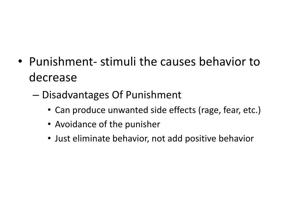 Punishment- stimuli the causes behavior to decrease • Disadvantages Of Punishment • Can produce unwanted side effects (rage, fear, etc.) • Avoidance of the punisher • Just eliminate behavior, not add positive behavior