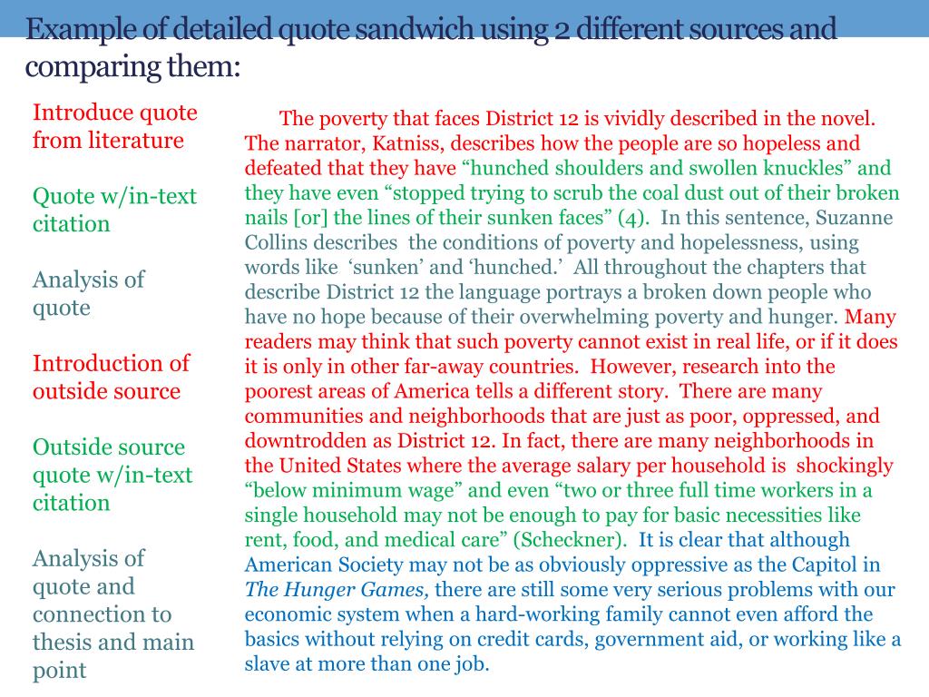 Example of detailed quote sandwich using2 different sources and comparing them: Introduce quote from literature Quote w/in-text citation Analysis of quote Introduction of outside source Outside source quote w/in-text citation Analysis of quote and connection to thesis and main point The poverty that faces District 12 is vividly described in the novel. The narrator, Katniss, describes how the people are so hopeless and defeated that they have “hunched shoulders and swollen knuckles” and they have even “stopped trying to scrub the coal dust out of their broken nails [or] the lines of their sunken faces” (4). In this sentence, Suzanne Collins describes the conditions of poverty and hopelessness, using words like ‘sunken’ and ‘hunched.’ All throughout the chapters that describe District 12 the language portrays a broken down people who have no hope because of their overwhelming poverty and hunger.Many readers may think that such poverty cannot exist in real life, or if it does it is only in other far-away countries. However, research into the poorest areas of America tells a different story. There are many communities and neighborhoods that are just as poor, oppressed, and downtrodden as District 12. In fact, there are many neighborhoods in the United States where the average salary per household is shockingly “below minimum wage” and even “two or three full time workers in a single household may not be enough to pay for basic necessities like rent, food, and medical care” (Scheckner). It is clear that although American Society may not be as obviously oppressive as the Capitol in The Hunger Games, there are still some very serious problems with our economic system when a hard-working family cannot even afford the basics without relying on credit cards, government aid, or working like a slave at more than one job.