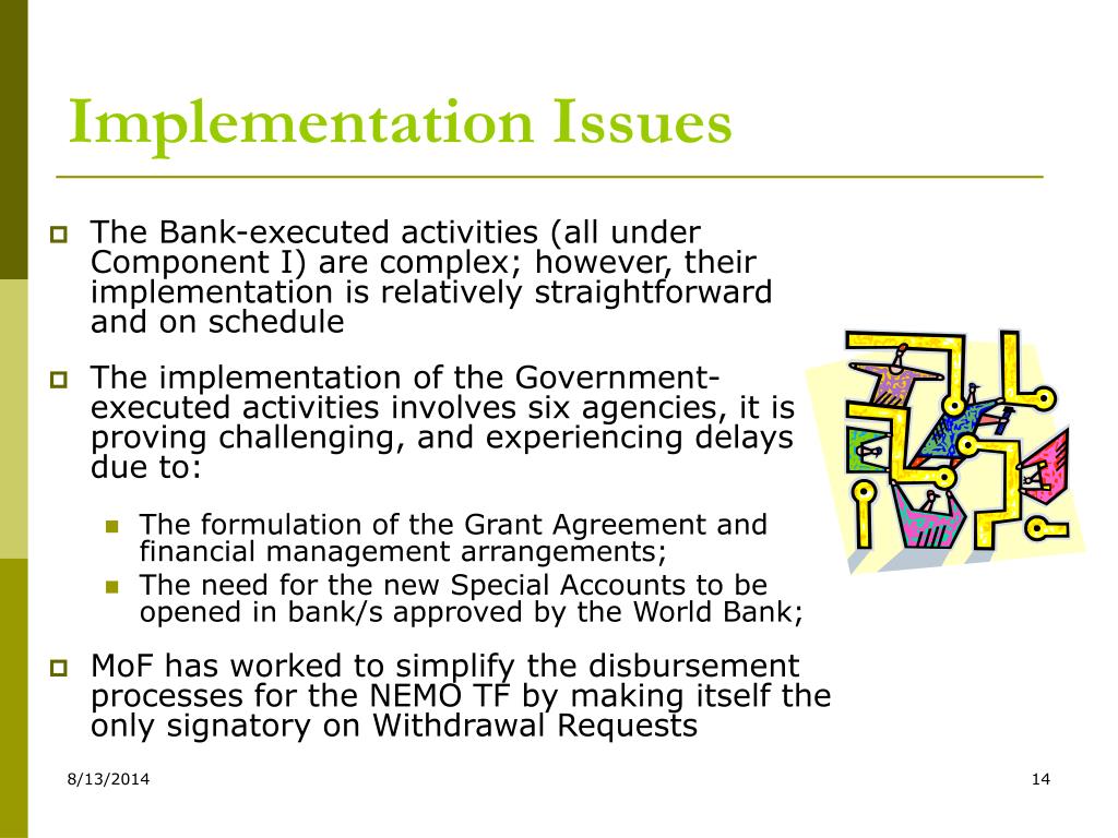 Implementation Issues • The Bank-executed activities (all under Component I) are complex; however, their implementation is relatively straightforward and on schedule • The implementation of the Government-executed activities involves six agencies, it is proving challenging, and experiencing delays due to: • The formulation of the Grant Agreement and financial management arrangements; • The need for the new Special Accounts to be opened in bank/s approved by the World Bank; • MoF has worked to simplify the disbursement processes for the NEMO TF by making itself the only signatory on Withdrawal Requests
