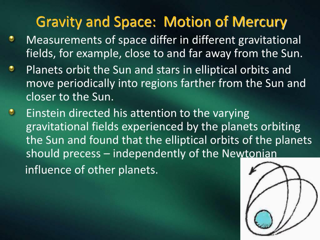 Gravity and Space: Motion of Mercury • Measurements of space differ in different gravitational fields, for example, close to and far away from the Sun. • Planets orbit the Sun and stars in elliptical orbits and move periodically into regions farther from the Sun and closer to the Sun. • Einstein directed his attention to the varying gravitational fields experienced by the planets orbiting the Sun and found that the elliptical orbits of the planets should precess – independently of the Newtonian influence of other planets.