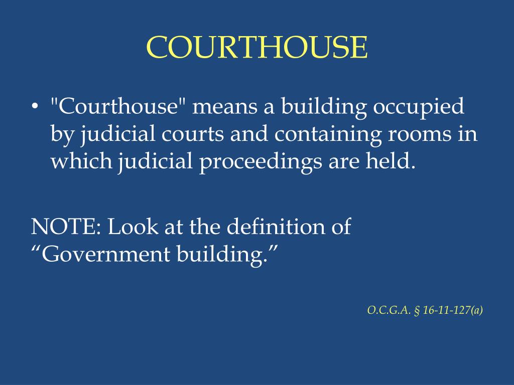 COURTHOUSE • "Courthouse" means a building occupied by judicial courts and containing rooms in which judicial proceedings are held. NOTE: Look at the definition of “Government building.” O.C.G.A. § 16-11-127(a)