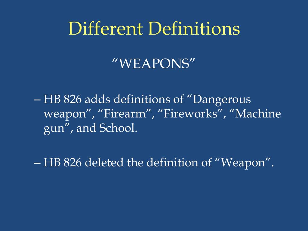 Different Definitions “WEAPONS” • HB 826 adds definitions of “Dangerous weapon”, “Firearm”, “Fireworks”, “Machine gun”, and School. • HB 826 deleted the definition of “Weapon”.