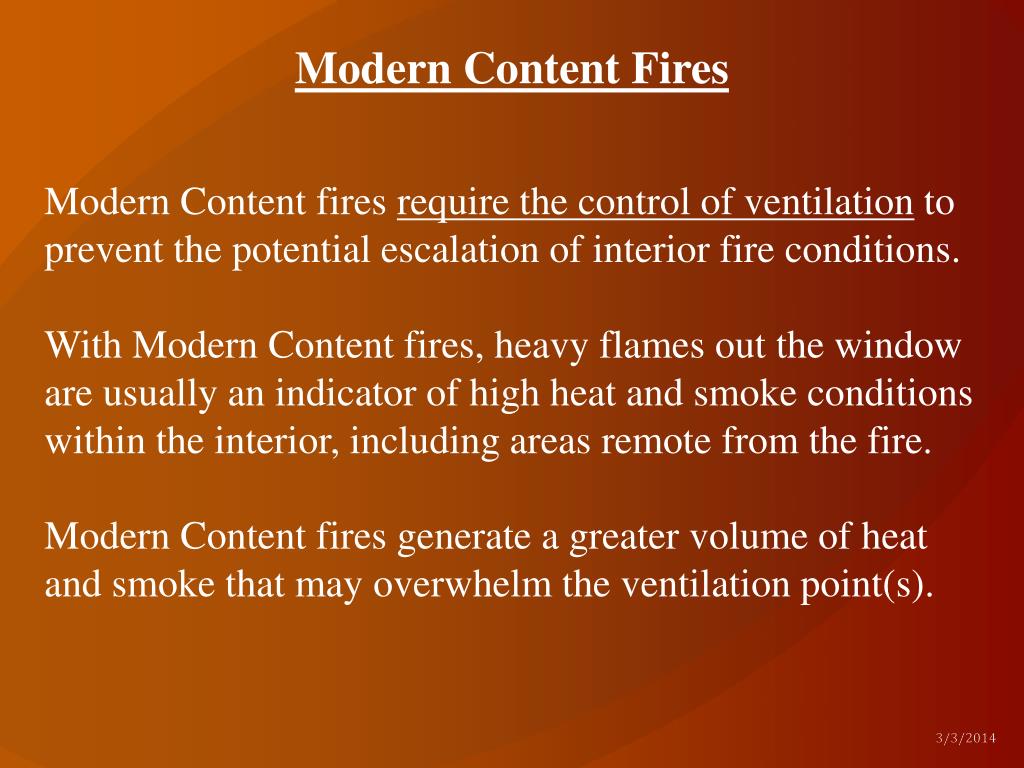 Modern Content Fires Modern Content fires require the control of ventilation to prevent the potential escalation of interior fire conditions. With Modern Content fires, heavy flames out the window are usually an indicator of high heat and smoke conditions within the interior, including areas remote from the fire. Modern Content fires generate a greater volume of heat and smoke that may overwhelm the ventilation point(s).