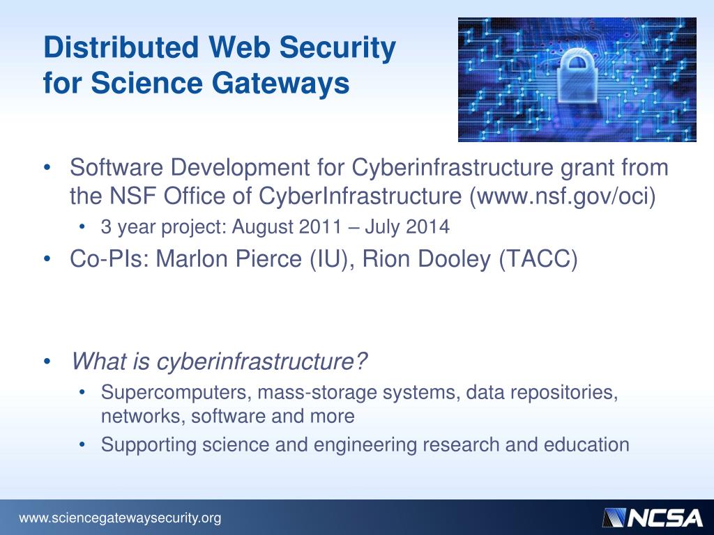 Distributed Web Securityfor Science Gateways • Software Development for Cyberinfrastructure grant from the NSF Office of CyberInfrastructure (www.nsf.gov/oci) • 3 year project: August 2011 – July 2014 • Co-PIs: Marlon Pierce (IU), Rion Dooley (TACC) • What is cyberinfrastructure? • Supercomputers, mass-storage systems, data repositories, networks, software and more • Supporting science and engineering research and education www.sciencegatewaysecurity.org