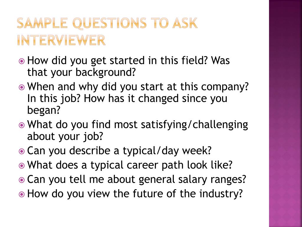 Sample Questions to Ask Interviewer • How did you get started in this field? Was that your background? • When and why did you start at this company? In this job? How has it changed since you began? • What do you find most satisfying/challenging about your job? • Can you describe a typical/day week? • What does a typical career path look like? • Can you tell me about general salary ranges? • How do you view the future of the industry?