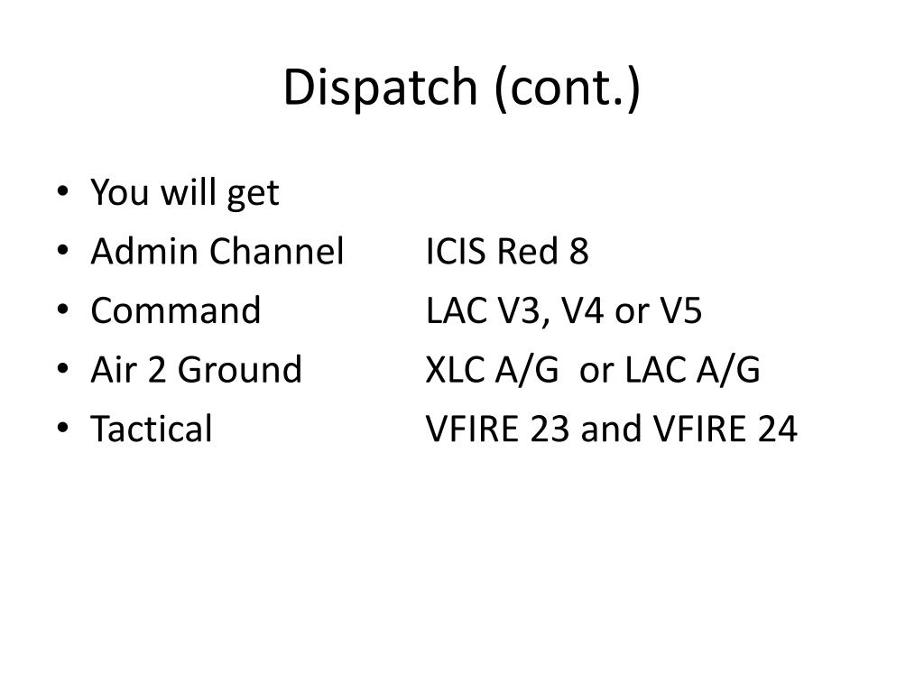 Dispatch (cont.) • You will get • Admin Channel ICIS Red 8 • Command LAC V3, V4 or V5 • Air 2 Ground XLC A/G or LAC A/G • Tactical VFIRE 23 and VFIRE 24