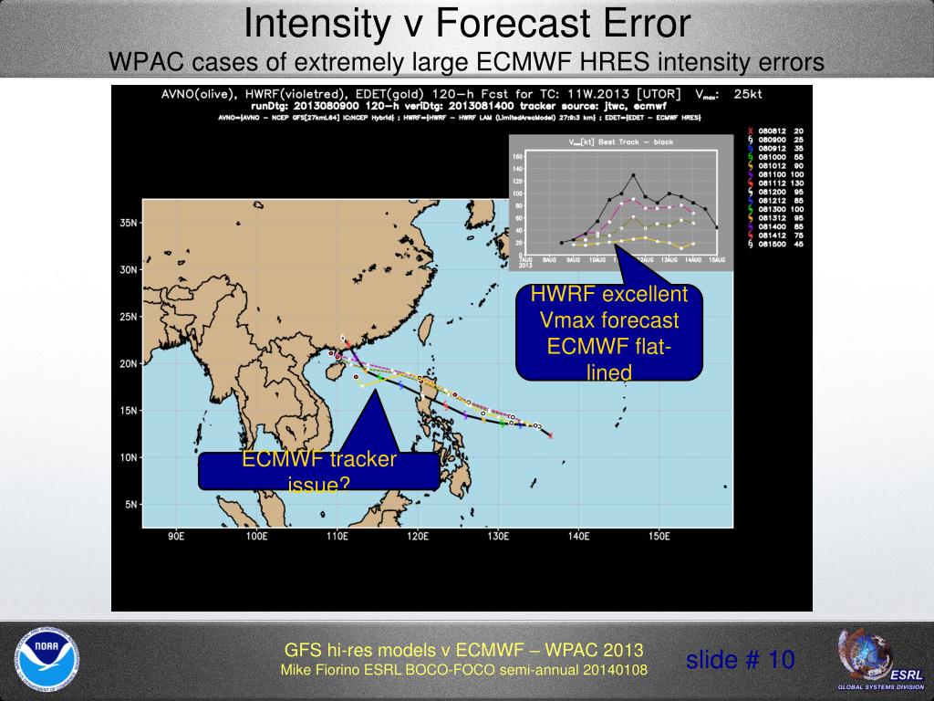 WPAC 2013 forecast error for BIG ECMWF intensity error storms07W, 11W, 17W, 22W, 28W, 31W • superior HWRF intensity errors do NOT translate into better track forecasts • errors lower than for all storms – well-behaved STYs