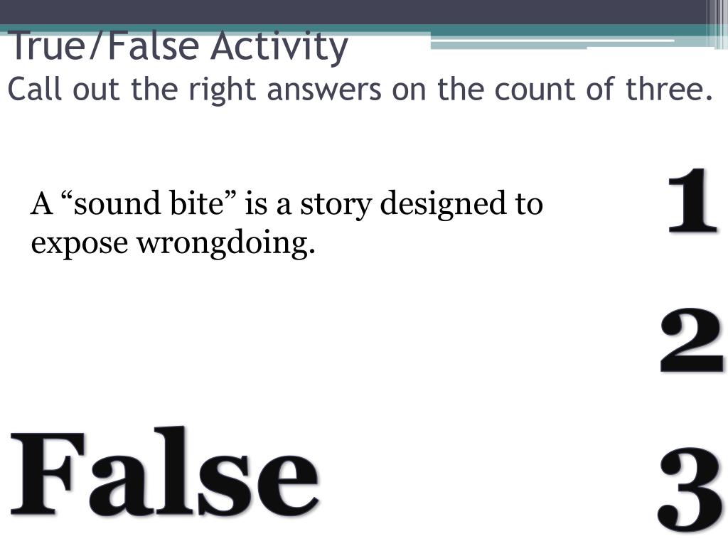 True/False ActivityCall out the right answers on the count of three. 1 2 3 A “sound bite” is a story designed to expose wrongdoing. False