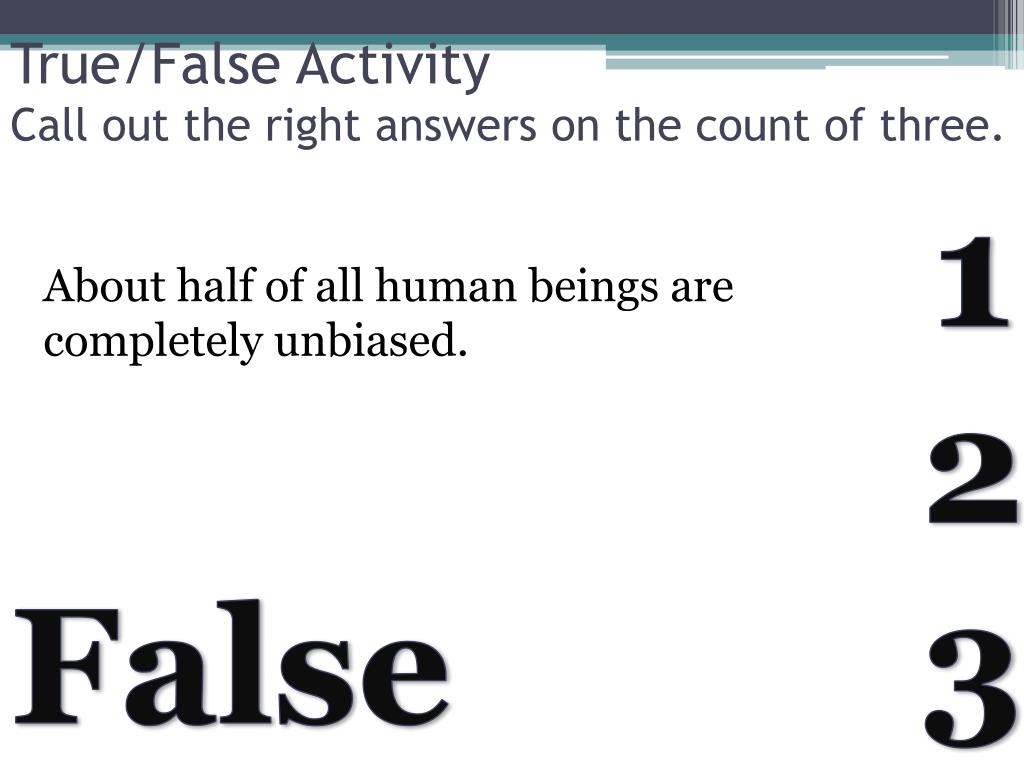 True/False ActivityCall out the right answers on the count of three. 1 2 3 About half of all human beings are completely unbiased. False