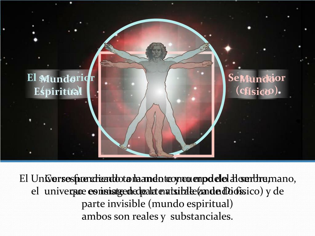 El ser interior (mente) Ser exterior (cuerpo) Mundo Espiritual Mundo físico El Universo fue creado tomando como modelo al ser humano, que es imagen de la naturaleza de Dios. Correspondiendo a la mente y cuerpo del hombre, el universo consiste de parte visible (mundo fisico) y de parte invisible (mundo espiritual) ambos son reales y substanciales.