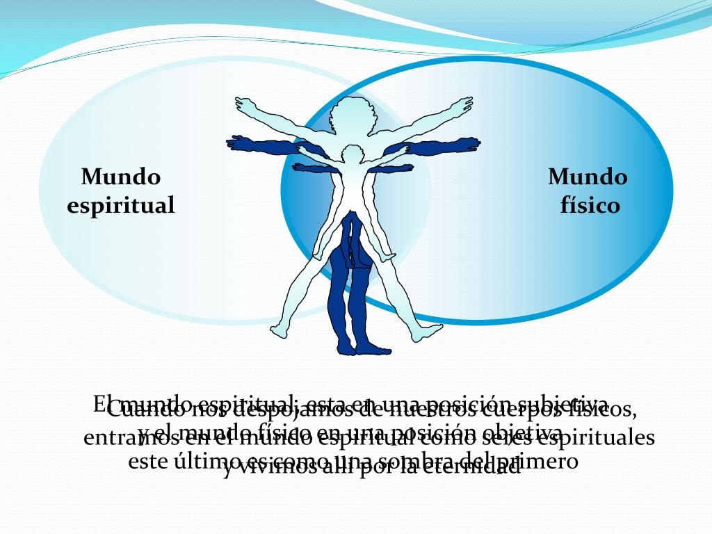 Mundo espiritual Mundo físico El mundo espiritual, esta en una posición subjetiva y el mundo físico en una posición objetiva este último es como una sombra del primero Cuando nos despojamos de nuestros cuerpos físicos, entramos en el mundo espiritual como seres espirituales y vivimos allí por la eternidad