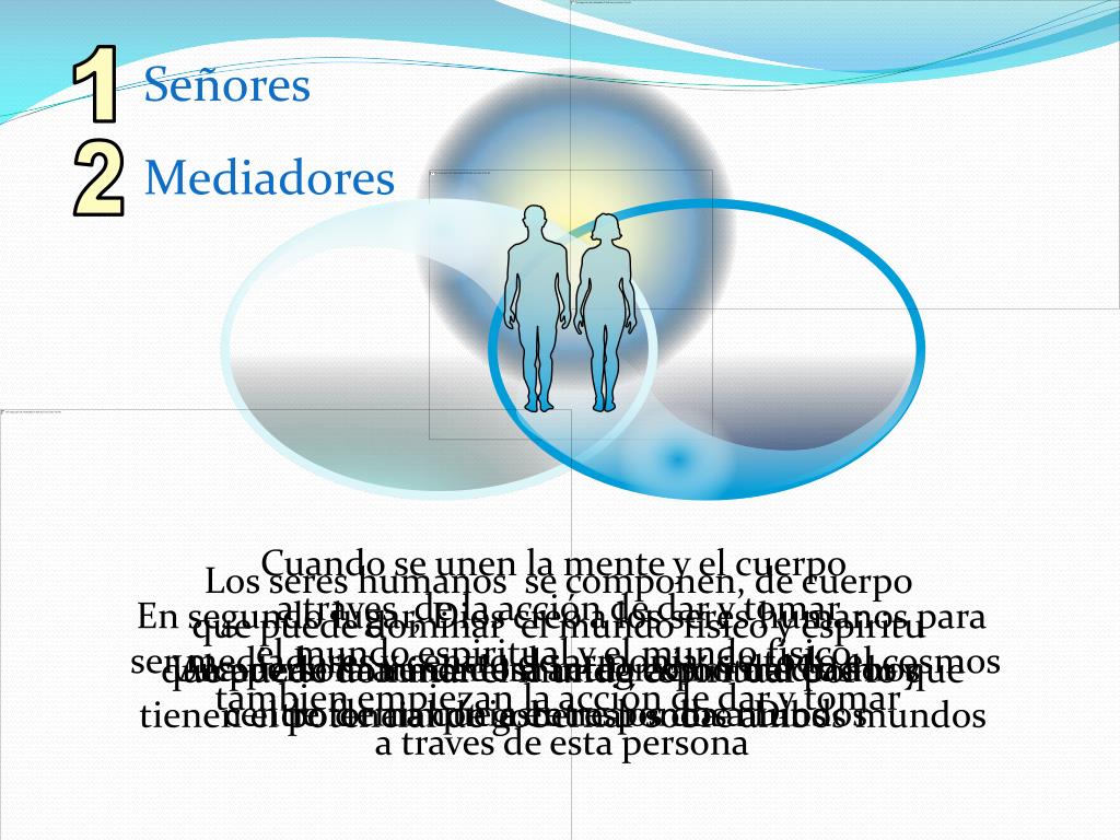 1 Señores 2 Mediadores Cuando se unen la mente y el cuerpo a traves de la acción de dar y tomar el mundo espiritual y el mundo fisico tambien empiezan la acción de dar y tomar a traves de esta persona Los seres humanos se componen, de cuerpo que puede dominar el mundo físico y espiritu que puede dominar el mundo espiritual por lo que tienen el potencial de gobernar sobre ambos mundos En segundo lugar, Dios creo a los seres humanos para ser mediadores y centro de armonía de todo el cosmos Una persona verdadera actua como mediador y centro de armonia entre los dos mundos Alcanzan la armoniosa integración del cosmos de forma que este responda a Dios