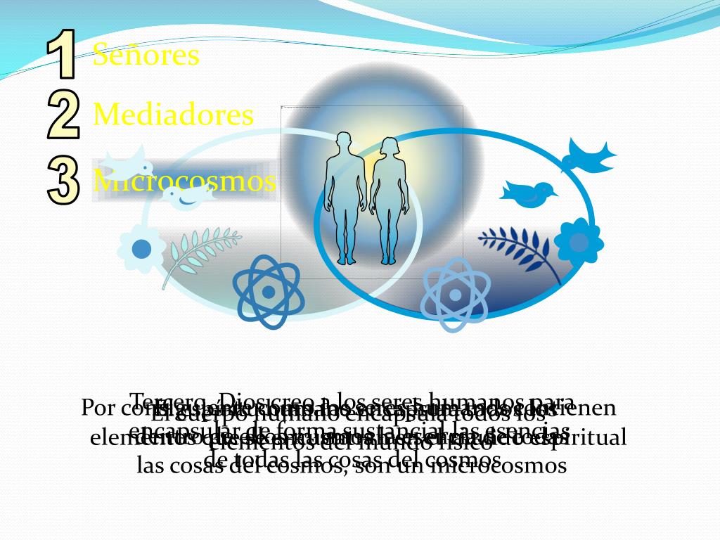 1 Señores 2 Mediadores 3 Microcosmos Tercero, Dios creo a los seres humanos para encapsular de forma sustancial las esencias de todas las cosas del cosmos Por consiguiente como los seres humanos contienen dentro de ellos mismos la esencia de todas las cosas del cosmos, son un microcosmos El espíritu humano encapsula todos los elementos que se encuentran en el mundo espiritual El cuerpo humano encapsula todos los elementos del mundo físico