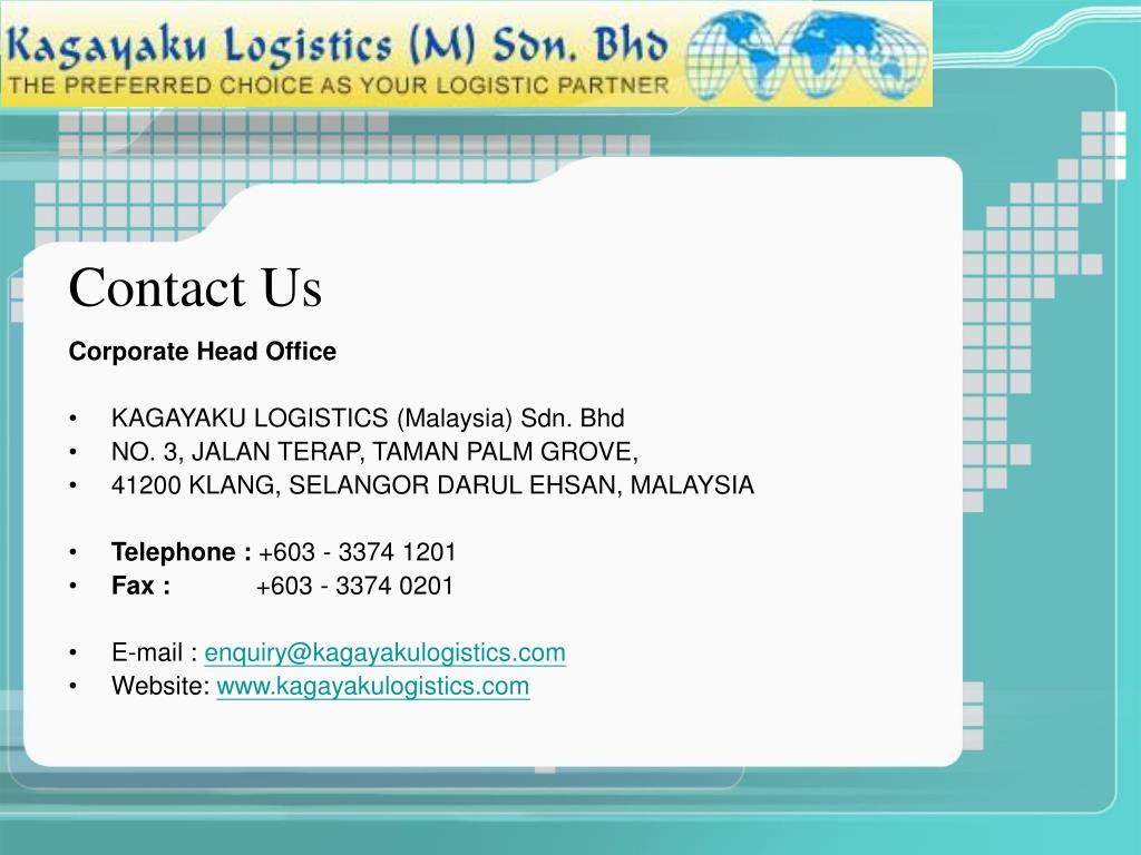 Contact Us Corporate Head Office • KAGAYAKU LOGISTICS (Malaysia) Sdn. Bhd • NO. 3, JALAN TERAP, TAMAN PALM GROVE, • 41200 KLANG, SELANGOR DARUL EHSAN, MALAYSIA • Telephone : +603 - 3374 1201 • Fax : +603 - 3374 0201 • E-mail : enquiry@kagayakulogistics.com • Website: www.kagayakulogistics.com