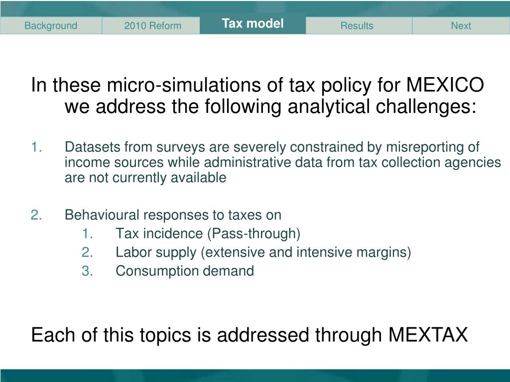 Tax model • In these micro-simulations of tax policy for MEXICO we address the following analytical challenges: • Datasets from surveys are severely constrained by misreporting of income sources while administrative data from tax collection agencies are not currently available • Behavioural responses to taxes on • Tax incidence (Pass-through) • Labor supply (extensive and intensive margins) • Consumption demand • Each of this topics is addressed through MEXTAX