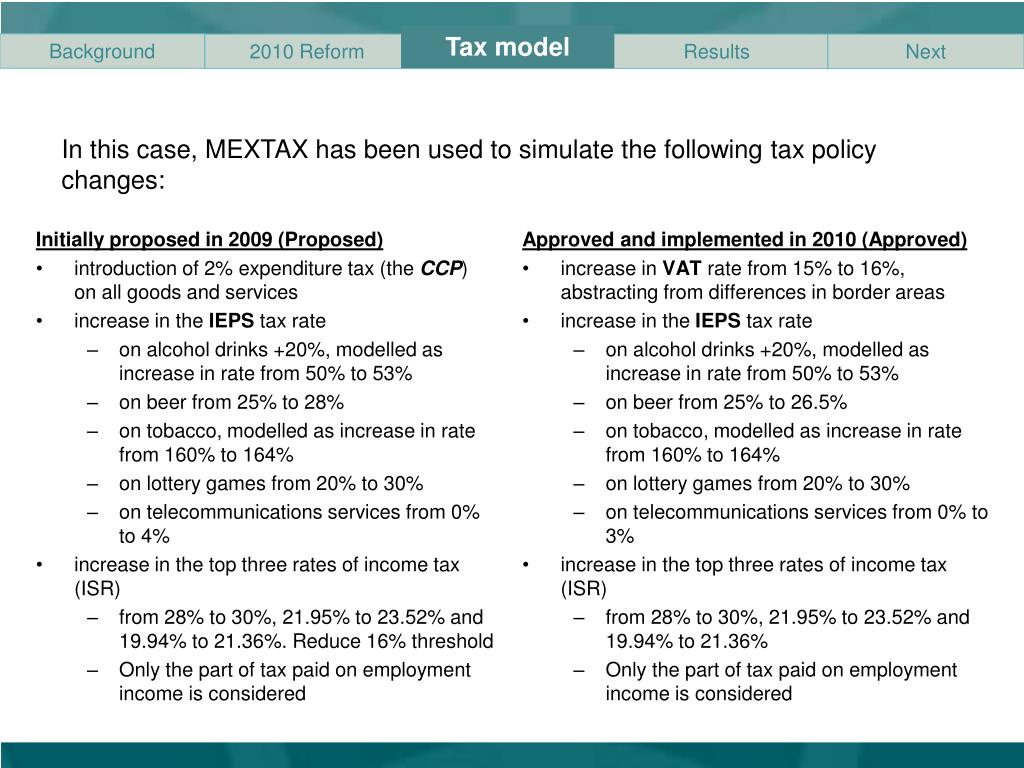 Tax model In this case, MEXTAX has been used to simulate the following tax policy changes: Initially proposed in 2009 (Proposed) • introduction of 2% expenditure tax (the CCP) on all goods and services • increase in the IEPS tax rate • on alcohol drinks +20%, modelled as increase in rate from 50% to 53% • on beer from 25% to 28% • on tobacco, modelled as increase in rate from 160% to 164% • on lottery games from 20% to 30% • on telecommunications services from 0% to 4% • increase in the top three rates of income tax (ISR) • from 28% to 30%, 21.95% to 23.52% and 19.94% to 21.36%. Reduce 16% threshold • Only the part of tax paid on employment income is considered Approved and implemented in 2010 (Approved) • increase in VAT rate from 15% to 16%, abstracting from differences in border areas • increase in the IEPS tax rate • on alcohol drinks +20%, modelled as increase in rate from 50% to 53% • on beer from 25% to 26.5% • on tobacco, modelled as increase in rate from 160% to 164% • on lottery games from 20% to 30% • on telecommunications services from 0% to 3% • increase in the top three rates of income tax (ISR) • from 28% to 30%, 21.95% to 23.52% and 19.94% to 21.36% • Only the part of tax paid on employment income is considered