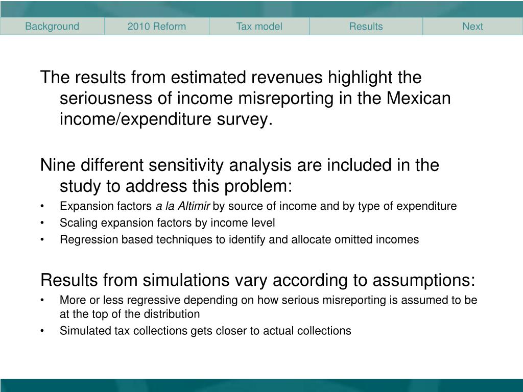 The results from estimated revenues highlight the seriousness of income misreporting in the Mexican income/expenditure survey. • Nine different sensitivity analysis are included in the study to address this problem: • Expansion factors a la Altimir by source of income and by type of expenditure • Scaling expansion factors by income level • Regression based techniques to identify and allocate omitted incomes • Results from simulations vary according to assumptions: • More or less regressive depending on how serious misreporting is assumed to be at the top of the distribution • Simulated tax collections gets closer to actual collections