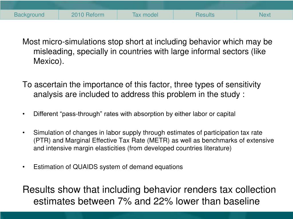 Most micro-simulations stop short at includingbehavior which may be misleading, specially in countries with large informal sectors (like Mexico). • To ascertain the importance of this factor, three types of sensitivity analysis are included to address this problem in the study : • Different “pass-through” rates with absorption by either labor or capital • Simulation of changes in labor supply through estimates of participation tax rate (PTR) and Marginal Effective Tax Rate (METR) as well as benchmarks of extensive and intensive margin elasticities (from developed countries literature) • Estimation of QUAIDS system of demand equations • Results show that including behavior renders tax collection estimates between 7% and 22% lower than baseline