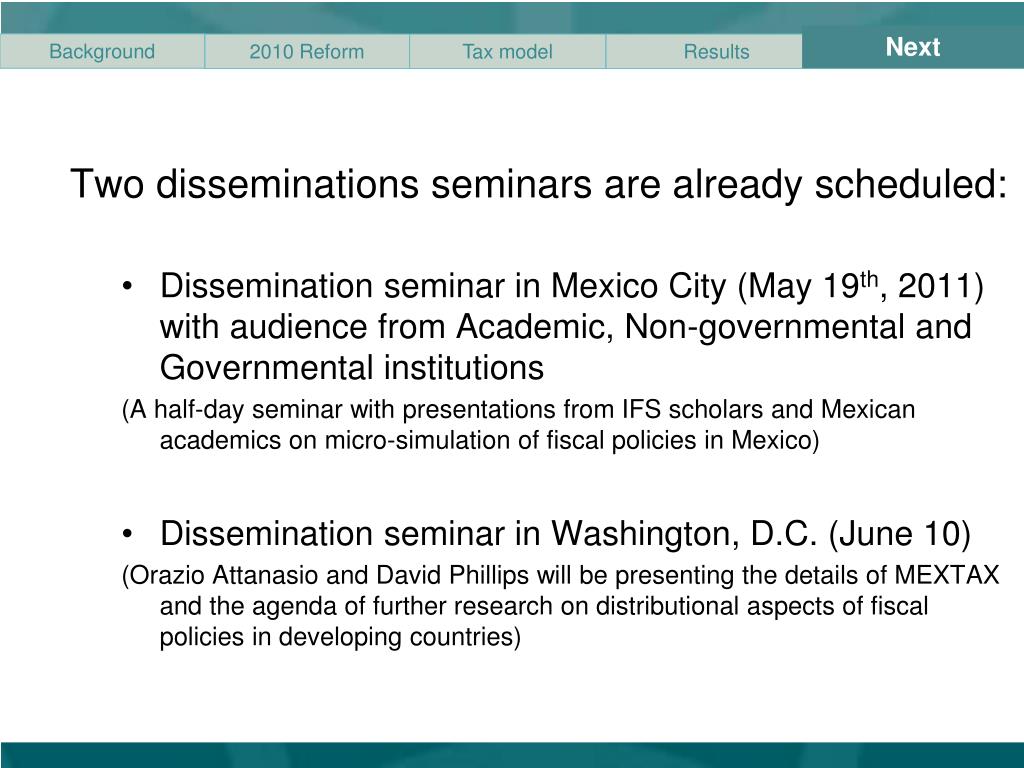 Next • Two disseminations seminars are already scheduled: • Dissemination seminar in Mexico City (May 19th, 2011) with audience from Academic, Non-governmental and Governmental institutions • (A half-day seminar with presentations from IFS scholars and Mexican academics on micro-simulation of fiscal policies in Mexico) • Dissemination seminar in Washington, D.C. (June 10) • (OrazioAttanasio and David Phillips will be presenting the details of MEXTAX and the agenda of further research on distributional aspects of fiscal policies in developing countries)