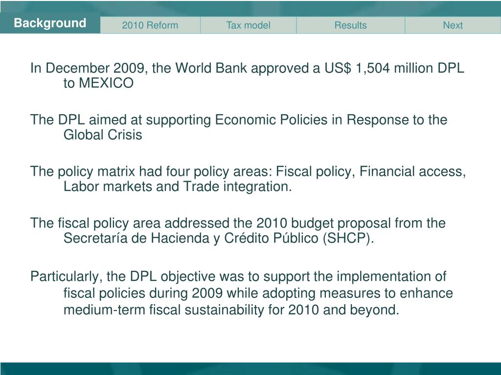 Background • InDecember 2009, the World Bank approved a US$ 1,504 million DPL to MEXICO • The DPL aimed at supporting Economic Policies in Response to the Global Crisis • The policy matrix had four policy areas: Fiscal policy, Financial access, Labor markets and Trade integration. • The fiscal policy area addressed the 2010 budget proposal from the Secretaría de Hacienda y CréditoPúblico (SHCP). • Particularly, the DPL objective was to support the implementation of fiscal policies during 2009 while adopting measures to enhance medium-term fiscal sustainability for 2010 and beyond.