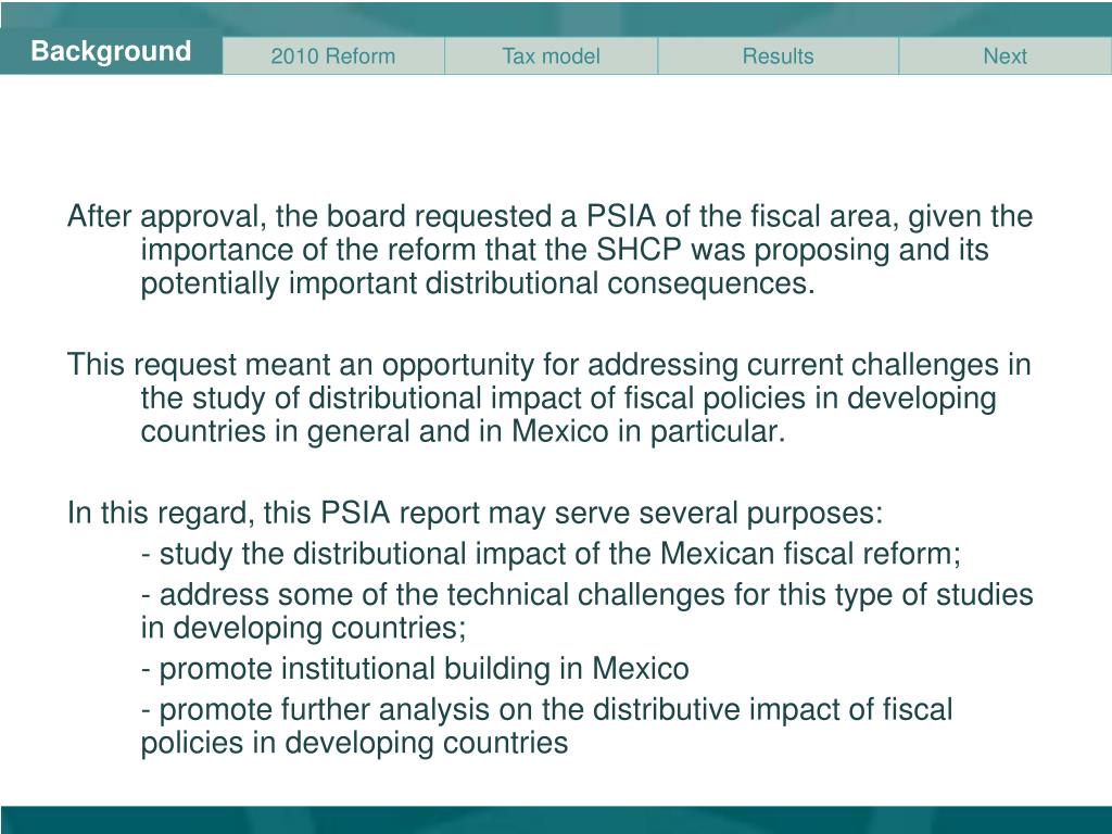 Background • After approval, the board requested a PSIA of the fiscal area, given the importance of the reform that the SHCP was proposing and its potentially important distributional consequences. • This request meant an opportunity for addressing current challenges in the study of distributional impact of fiscal policies in developing countries in general and in Mexico in particular. • In this regard, this PSIA report may serve several purposes: • - study the distributional impact of the Mexican fiscal reform; • - address some of the technical challenges for this type of studies in developing countries; • - promote institutional building in Mexico • - promote further analysis on the distributive impact of fiscal policies in developing countries