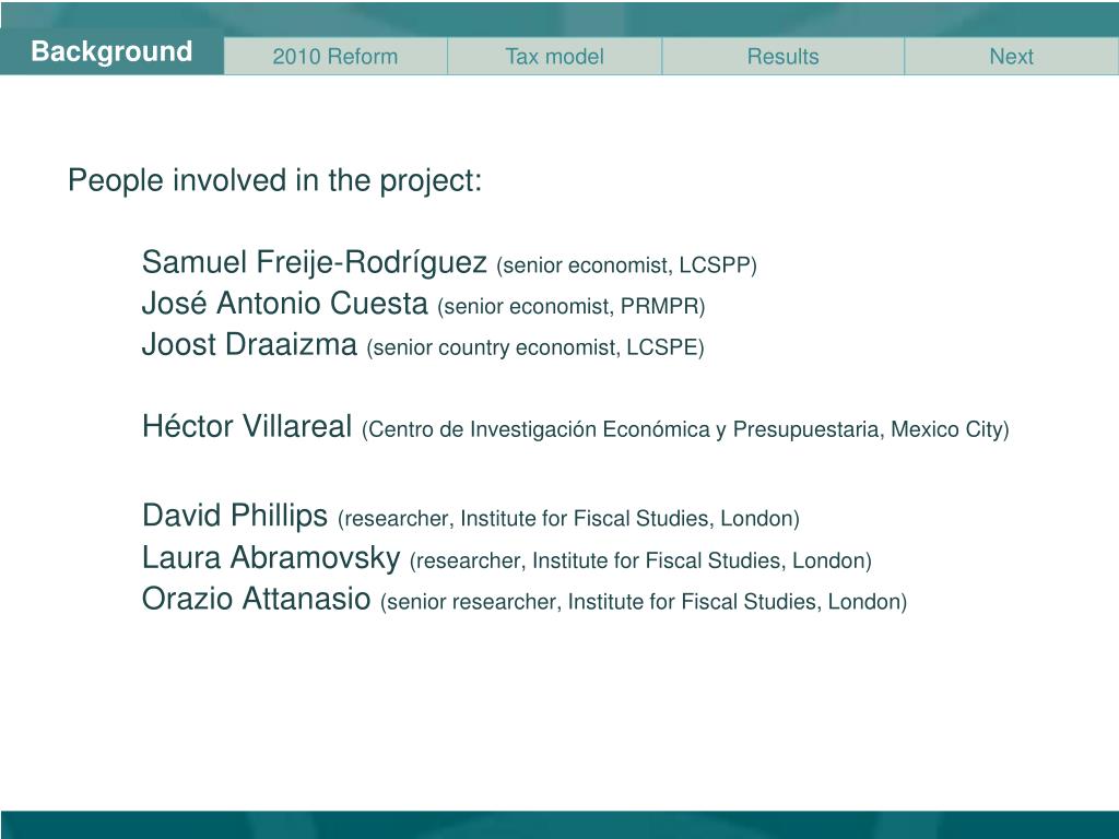 Background • People involved in the project: • Samuel Freije-Rodríguez(senior economist, LCSPP) • José Antonio Cuesta(senior economist, PRMPR) • JoostDraaizma(senior country economist, LCSPE) • HéctorVillareal(Centro de InvestigaciónEconómica y Presupuestaria, Mexico City) • David Phillips (researcher, Institute for Fiscal Studies, London) • Laura Abramovsky(researcher, Institute for Fiscal Studies, London) • OrazioAttanasio(senior researcher, Institute for Fiscal Studies, London)