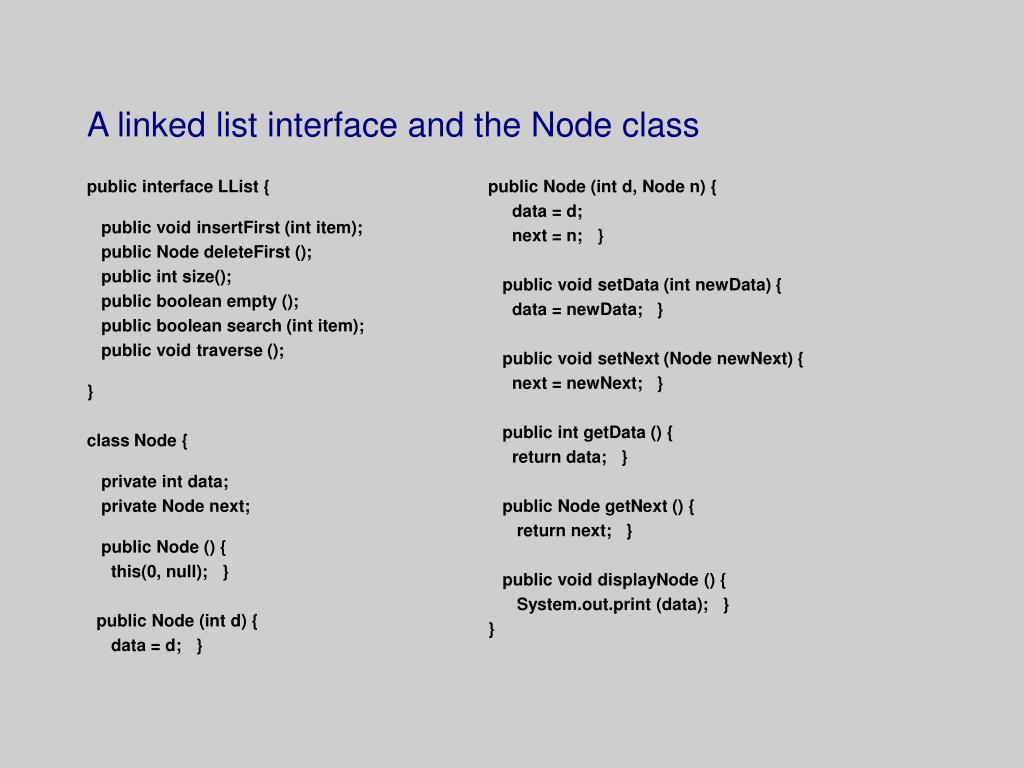 public interface LList { public void insertFirst (int item); public Node deleteFirst (); public int size(); public boolean empty (); public boolean search (int item); public void traverse (); } class Node { private int data; private Node next; public Node () { this(0, null); } public Node (int d) { data = d; } public Node (int d, Node n) { data = d; next = n; } public void setData (int newData) { data = newData; } public void setNext (Node newNext) { next = newNext; } public int getData () { return data; } public Node getNext () { return next; } public void displayNode () { System.out.print (data); } } A linked list interface and the Node class
