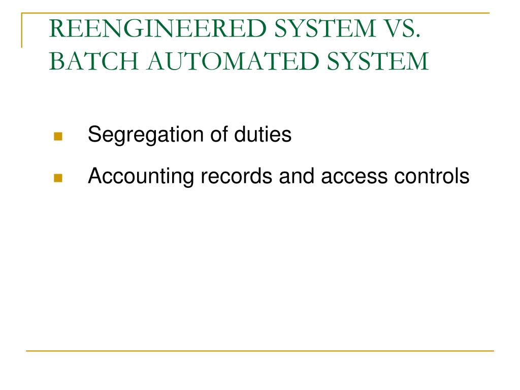 REENGINEERED SYSTEM VS.BATCH AUTOMATED SYSTEM • Segregation of duties • Accounting records and access controls