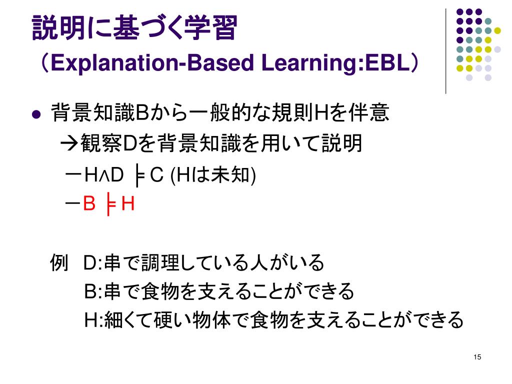 説明に基づく学習(Explanation-Based Learning:EBL) • 背景知識Bから一般的な規則Hを伴意 観察Dを背景知識を用いて説明 -H∧D ╞ C (Hは未知) -B ╞ H 例 D:串で調理している人がいる B:串で食物を支えることができる H:細くて硬い物体で食物を支えることができる