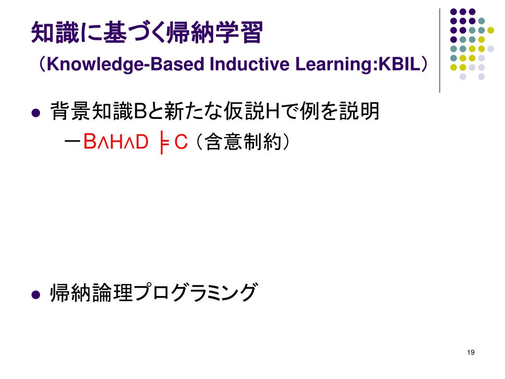 知識に基づく帰納学習(Knowledge-Based Inductive Learning:KBIL) • 背景知識Bと新たな仮説Hで例を説明 -B∧H∧D ╞ C(含意制約) • 帰納論理プログラミング