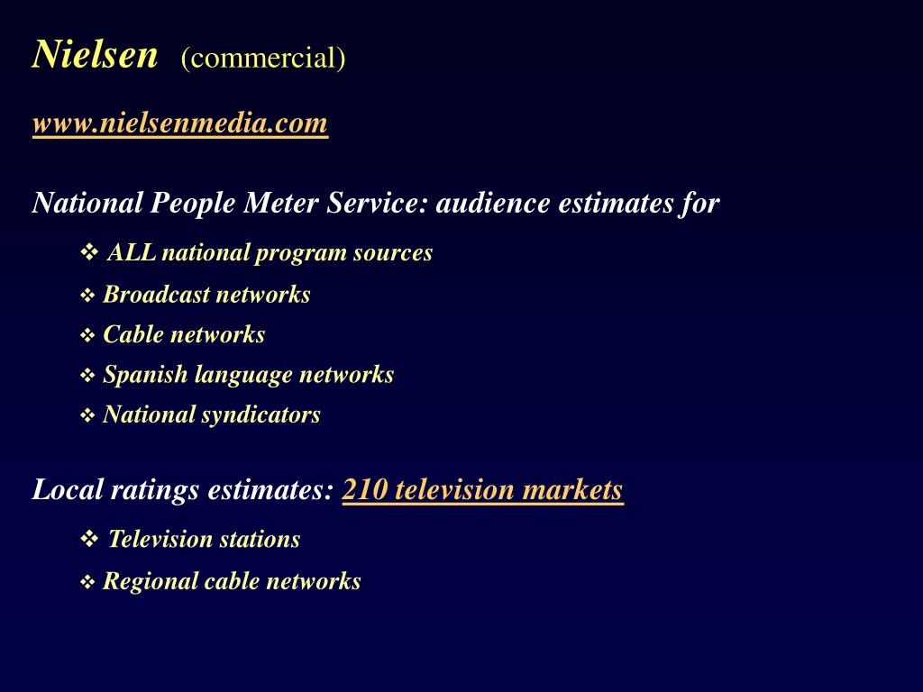 Nielsen (commercial) www.nielsenmedia.com National People Meter Service: audience estimates for ALL national program sources Broadcast networks Cable networks Spanish language networks National syndicators Local ratings estimates: 210 television markets Television stations Regional cable networks