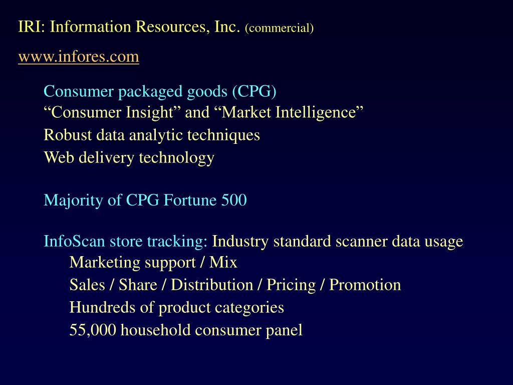 IRI: Information Resources, Inc. (commercial) www.infores.com Consumer packaged goods (CPG) “Consumer Insight” and “Market Intelligence” Robust data analytic techniques Web delivery technology Majority of CPG Fortune 500 InfoScan store tracking: Industry standard scanner data usage Marketing support / Mix Sales / Share / Distribution / Pricing / Promotion Hundreds of product categories 55,000 household consumer panel