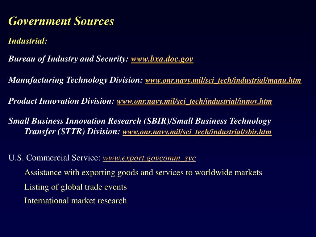 Government Sources Industrial: Bureau of Industry and Security: www.bxa.doc.gov Manufacturing Technology Division: www.onr.navy.mil/sci_tech/industrial/manu.htm Product Innovation Division: www.onr.navy.mil/sci_tech/industrial/innov.htm Small Business Innovation Research (SBIR)/Small Business Technology Transfer (STTR) Division: www.onr.navy.mil/sci_tech/industrial/sbir.htm U.S. Commercial Service: www.export.govcomm_svc Assistance with exporting goods and services to worldwide markets Listing of global trade events International market research
