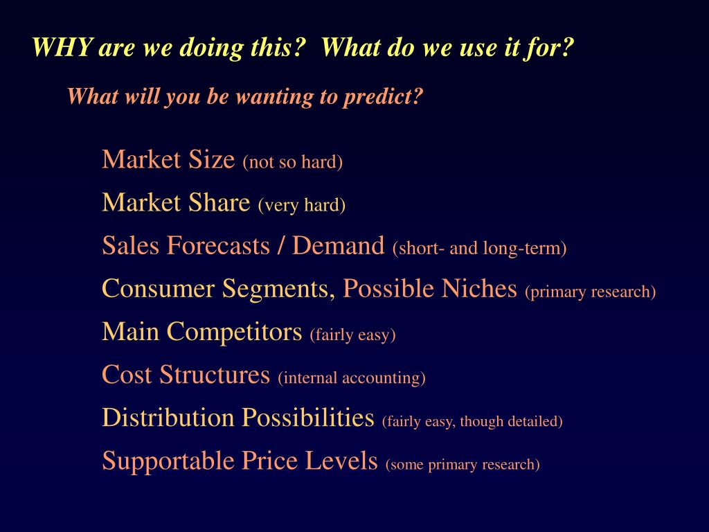 WHY are we doing this? What do we use it for? What will you be wanting to predict? Market Size (not so hard) Market Share (very hard) Sales Forecasts / Demand (short- and long-term) Consumer Segments, Possible Niches (primary research) Main Competitors (fairly easy) Cost Structures (internal accounting) Distribution Possibilities (fairly easy, though detailed) Supportable Price Levels (some primary research)