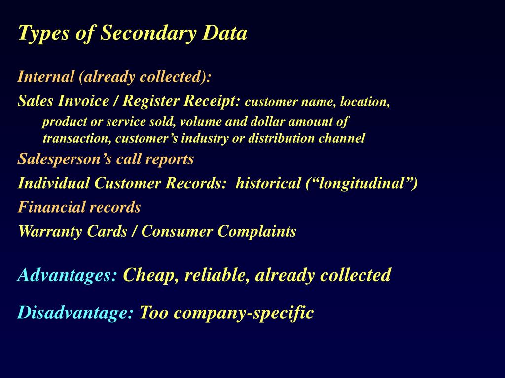 Types of Secondary Data Internal (already collected): Sales Invoice / Register Receipt: customer name, location, product or service sold, volume and dollar amount of transaction, customer’s industry or distribution channel Salesperson’s call reports Individual Customer Records: historical (“longitudinal”) Financial records Warranty Cards / Consumer Complaints Advantages: Cheap, reliable, already collected Disadvantage: Too company-specific