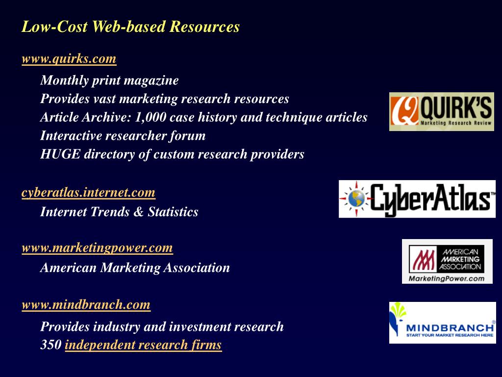Low-Cost Web-based Resources www.quirks.com Monthly print magazine Provides vast marketing research resources Article Archive: 1,000 case history and technique articles Interactive researcher forum HUGE directory of custom research providers cyberatlas.internet.com Internet Trends & Statistics www.marketingpower.com American Marketing Association www.mindbranch.com Provides industry and investment research 350 independent research firms