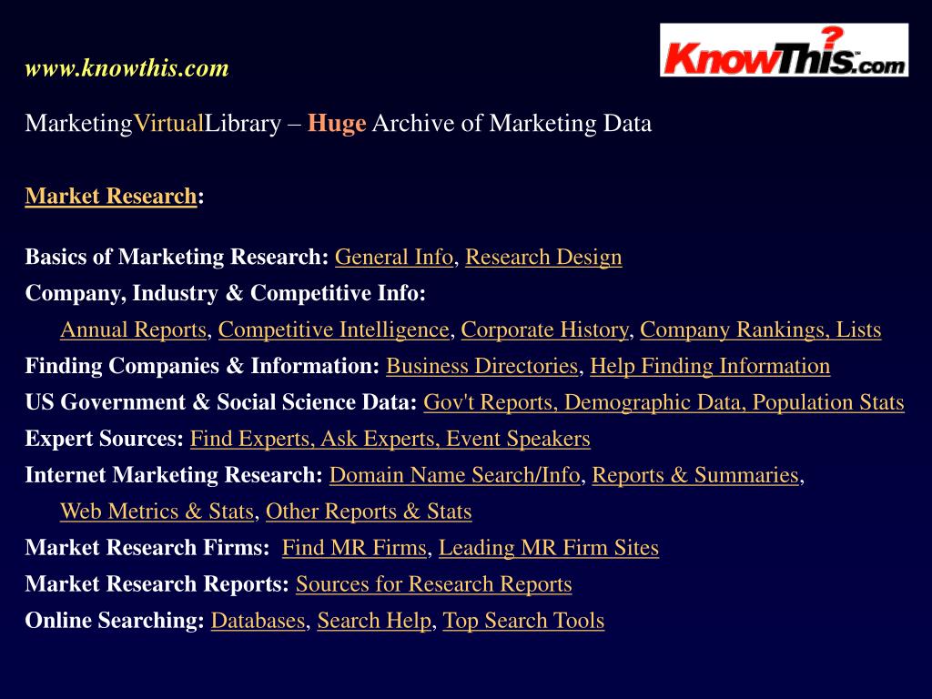 www.knowthis.com MarketingVirtualLibrary – Huge Archive of Marketing Data Market Research: Basics of Marketing Research: General Info, Research Design Company, Industry & Competitive Info: Annual Reports, Competitive Intelligence, Corporate History, Company Rankings, Lists Finding Companies & Information: Business Directories, Help Finding Information US Government & Social Science Data: Gov't Reports, Demographic Data, Population Stats Expert Sources: Find Experts, Ask Experts, Event Speakers Internet Marketing Research: Domain Name Search/Info, Reports & Summaries, Web Metrics & Stats, Other Reports & Stats Market Research Firms: Find MR Firms, Leading MR Firm Sites Market Research Reports: Sources for Research Reports Online Searching: Databases, Search Help, Top Search Tools