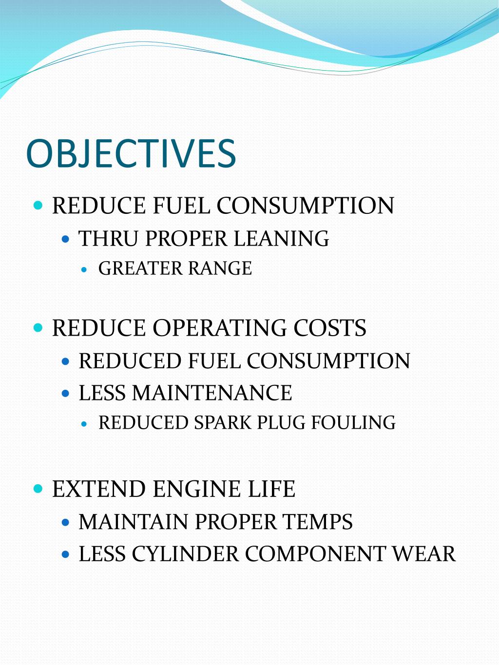 OBJECTIVES • REDUCE FUEL CONSUMPTION • THRU PROPER LEANING • GREATER RANGE • REDUCE OPERATING COSTS • REDUCED FUEL CONSUMPTION • LESS MAINTENANCE • REDUCED SPARK PLUG FOULING • EXTEND ENGINE LIFE • MAINTAIN PROPER TEMPS • LESS CYLINDER COMPONENT WEAR