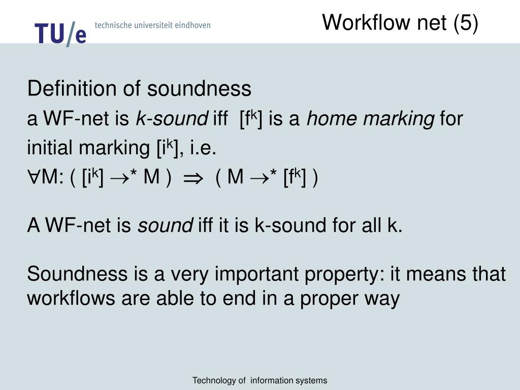 Workflow net (5) Definition of soundness aWF-net is k-sound iff [fk] is a home marking for initial marking [ik], i.e. M: ( [ik] * M ) ( M * [fk] ) A WF-net is sound iff it is k-sound for all k. Soundness is a very important property: it means that workflows are able to end in a proper way Technology of information systems
